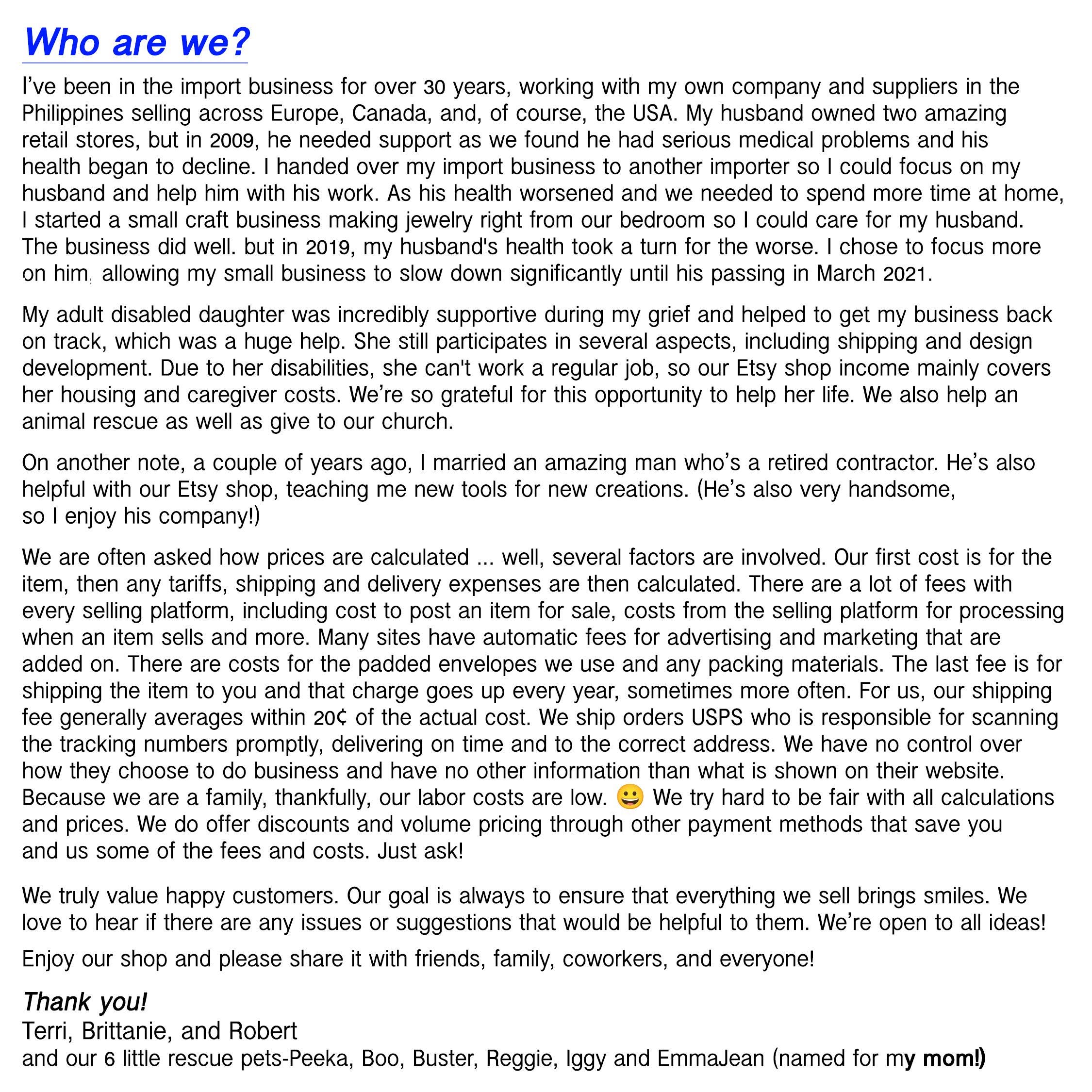 * Etsy. I share information with Etsy as necessary to provide you my services and comply with my obligations under both the Etsy Seller Policy and Etsy Terms of Use.