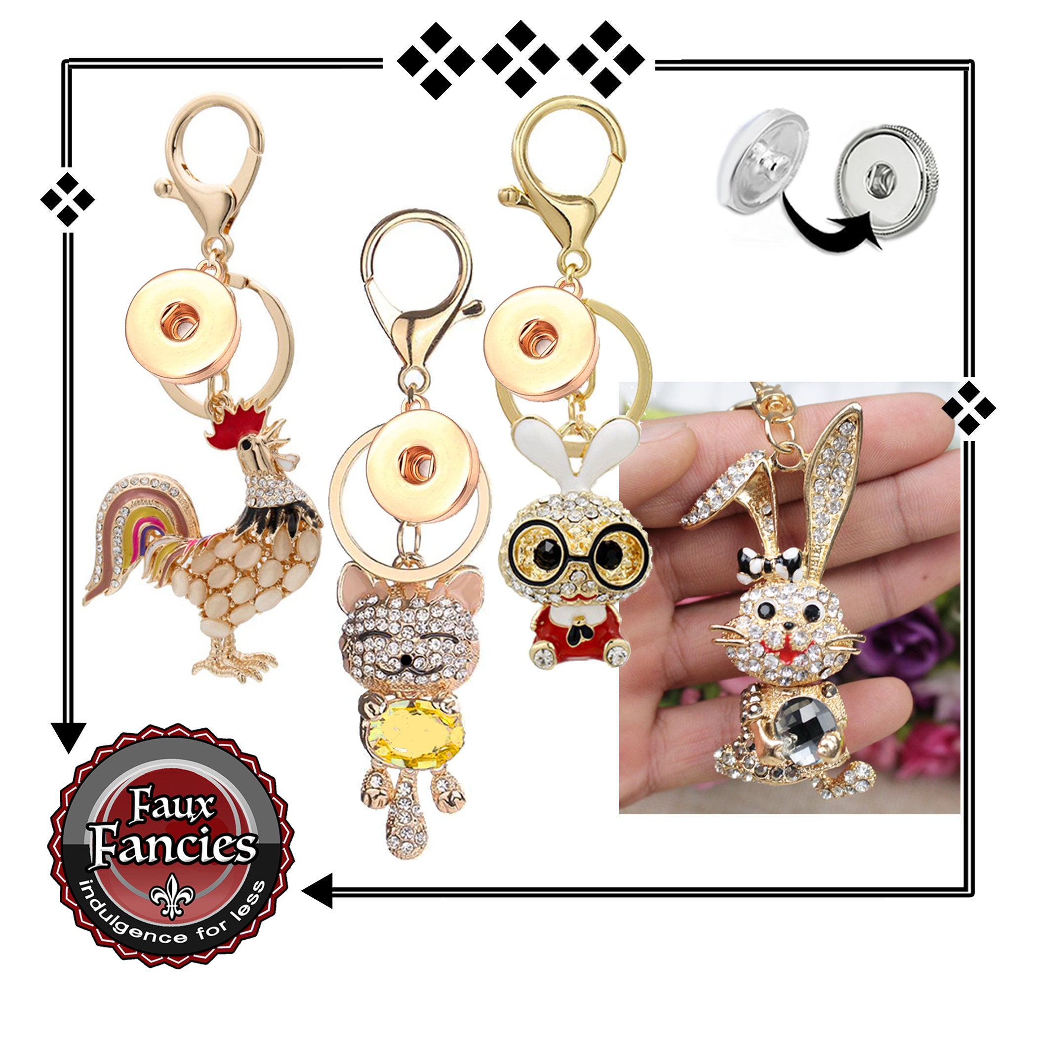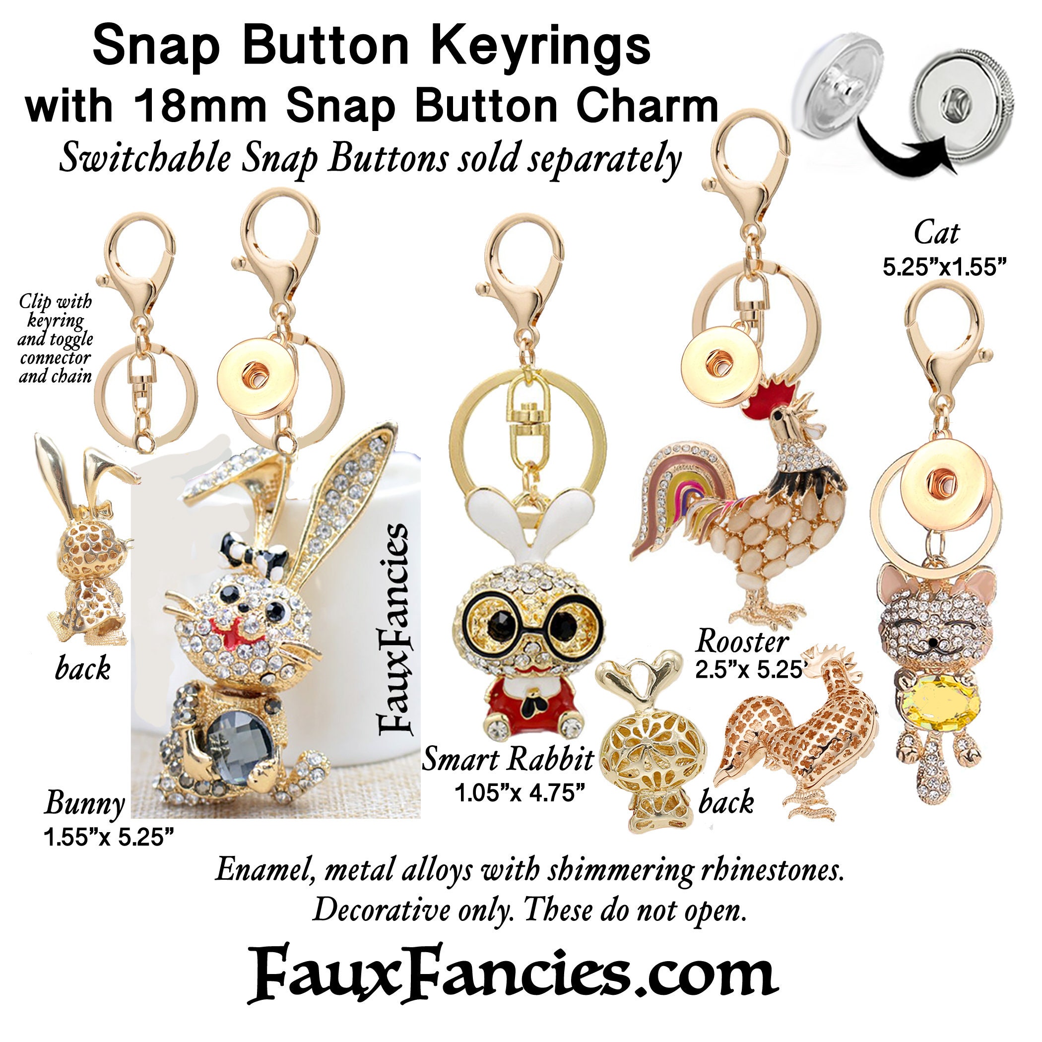 Well made, GORGEOUS Rhinestone KEYRING Animals - very beautiful GREAT KEY RINGS with 18mm snap base for Switchable Snap Buttons, Ginger Snaps, Snap Charms