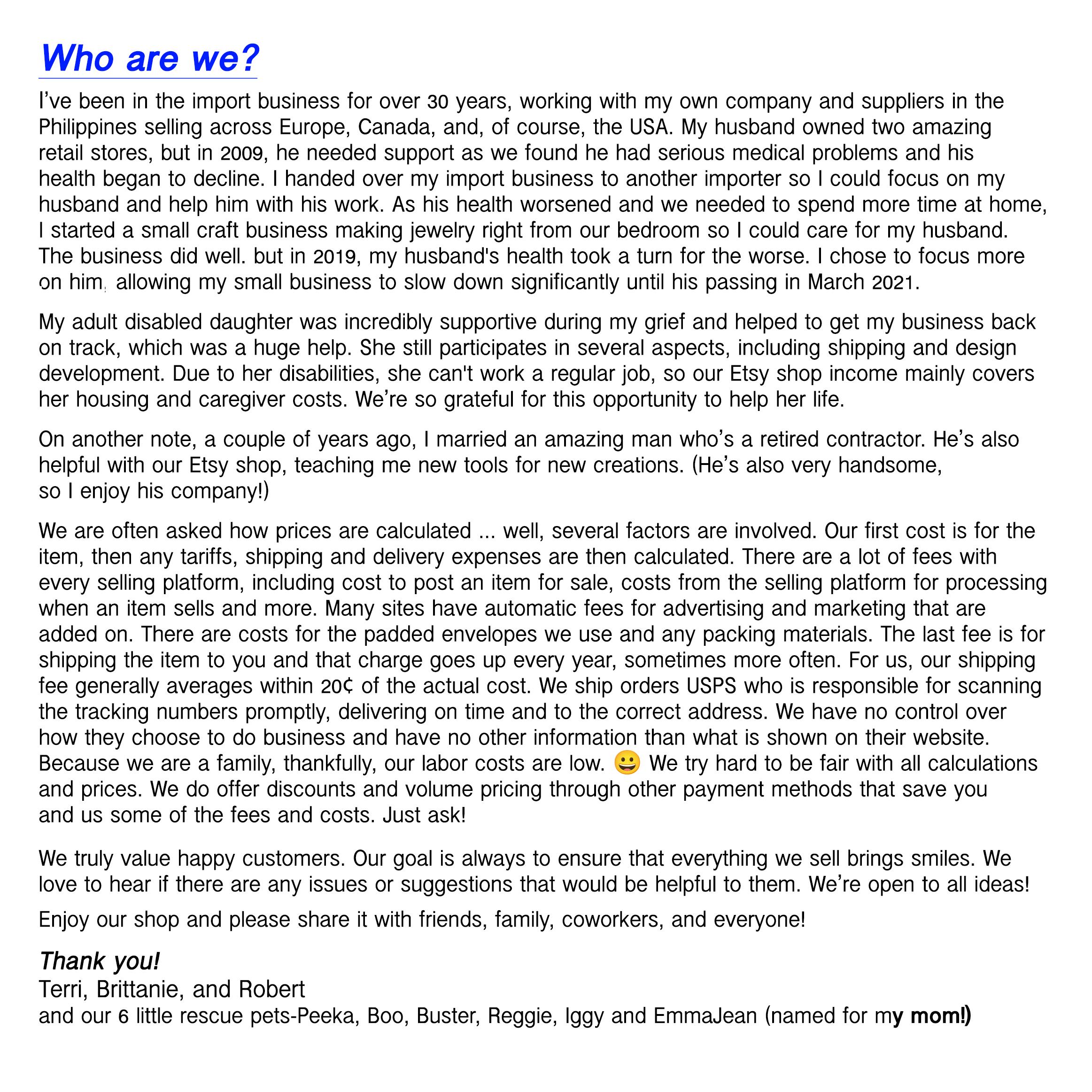 * Etsy. I share information with Etsy as necessary to provide you my services and comply with my obligations under both the Etsy Seller Policy and Etsy Terms of Use.